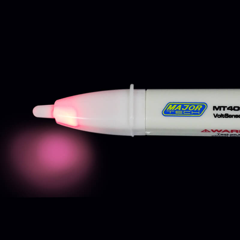 Use MT400 to quickly check for the presence of live wires before performing any electrical testing. Suitable for outlets or against wire insulation testing, this AC Voltage Detector is for non-contact detection of AC Voltage from 50 to 600V (50/60Hz). The Red LED in the tip indicates the presence of voltage.Voltage tester
