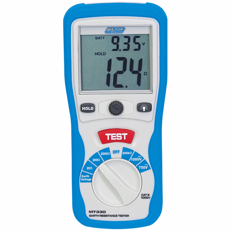 The MT330 is an ideal earth resistance tester for the measurement of earth rods and lightning conductors. Other ranges have been included such as AC voltage measurement up to 750V and DC voltage up to 1000V. A 200kΩ resistance range. The large backlit dual display LCD indicates the range measured as well as the battery voltage. The advanced circuit design permits the instrument to operate with minimum influence. From earth voltage and earth resistance of auxiliary spikes. The double moulded rubber injection housing ensures that the meter can handle the rough terrain. When used in the field while performing earth tests.