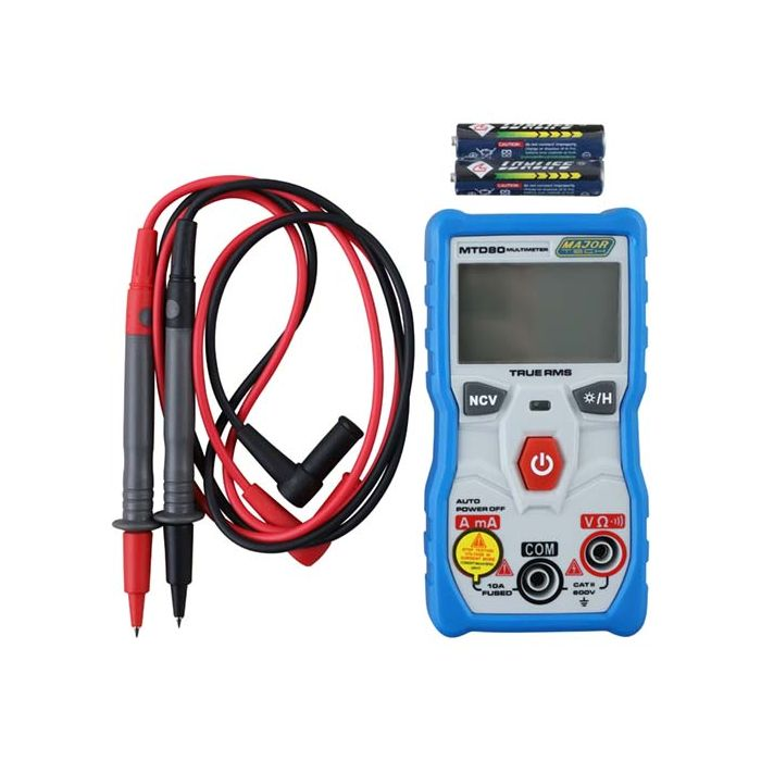 The MTD80 is a Compact True RMS Auto Ranging Multimeter with a 4000 count LCD backlit display. The meter always operates in the Smart mode “AUTO” function that automatically identifies DC voltage. AC voltage, Resistance and continuity buzzer and automatically displays the measurements. There is a built-in Non-Contact voltage detector. By pressing the NCV button continuously the LCD displays “EF” and will display “—-“ . When voltage is detected and the buzzer sounds. This meter meets the International Standard IEC 61010-1 CAT II 600V/ CAT III 300V, and is ideally suited for users who wants a simple meter to automatically read the measurement of the circuit or system under test. Ideal for everyday use by electricians, electronic technicians, alarm installers, students and DIY users. The meter has a rubber holster with a built-in tilt stand for hands free convenience as well as low battery indication and auto power off.