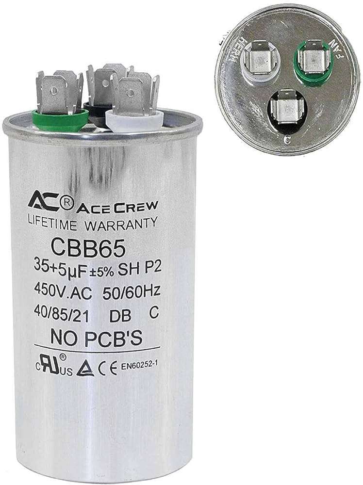 Start (55 uF). When the AC turns on, the 55 uF section gives the compressor a big electrical “kick” (high torque). To overcome inertia and start spinning, then a centrifugal switch cuts it out of the circuit.