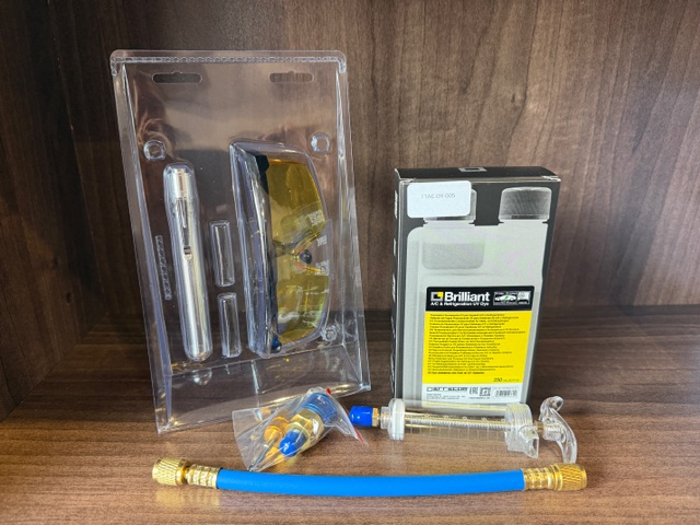 Brilliant Set is a universal kit for HVAC&R that contains everything needed. To introduce the leak detector dye and locate the leak.Works for refrigeration and and air conditioners. Also work on car aircon. Add 7.5 ML to system let the system run and inspect the aircon system. With flash light for leak and leak will make a color to easy find leaks. for small to big leaks. Does not harm the aircon system.